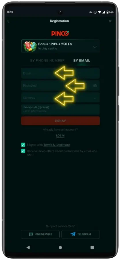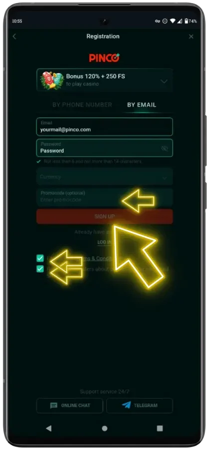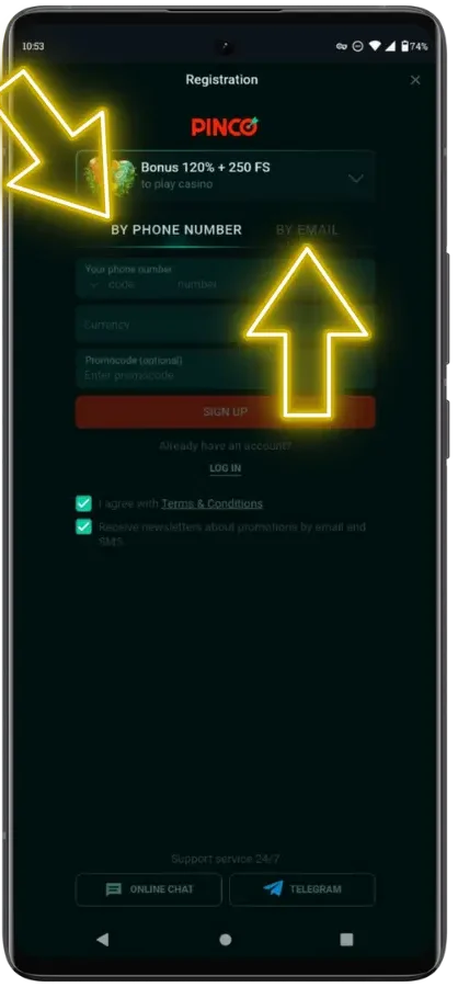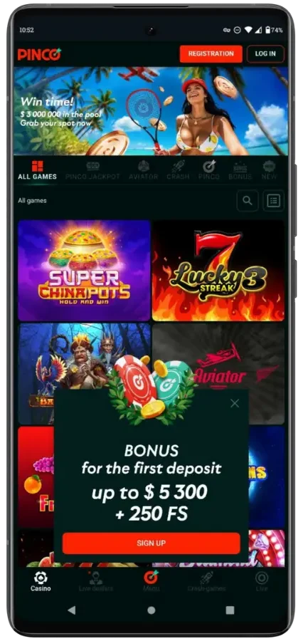 В приложении Pinco APK доступны три способа регистрации: по номеру телефона, через электронную почту и с помощью социальных сетей. Все варианты позволяют быстро создать аккаунт и получить доступ ко всем функциям — от депозитов до бонусных игр.